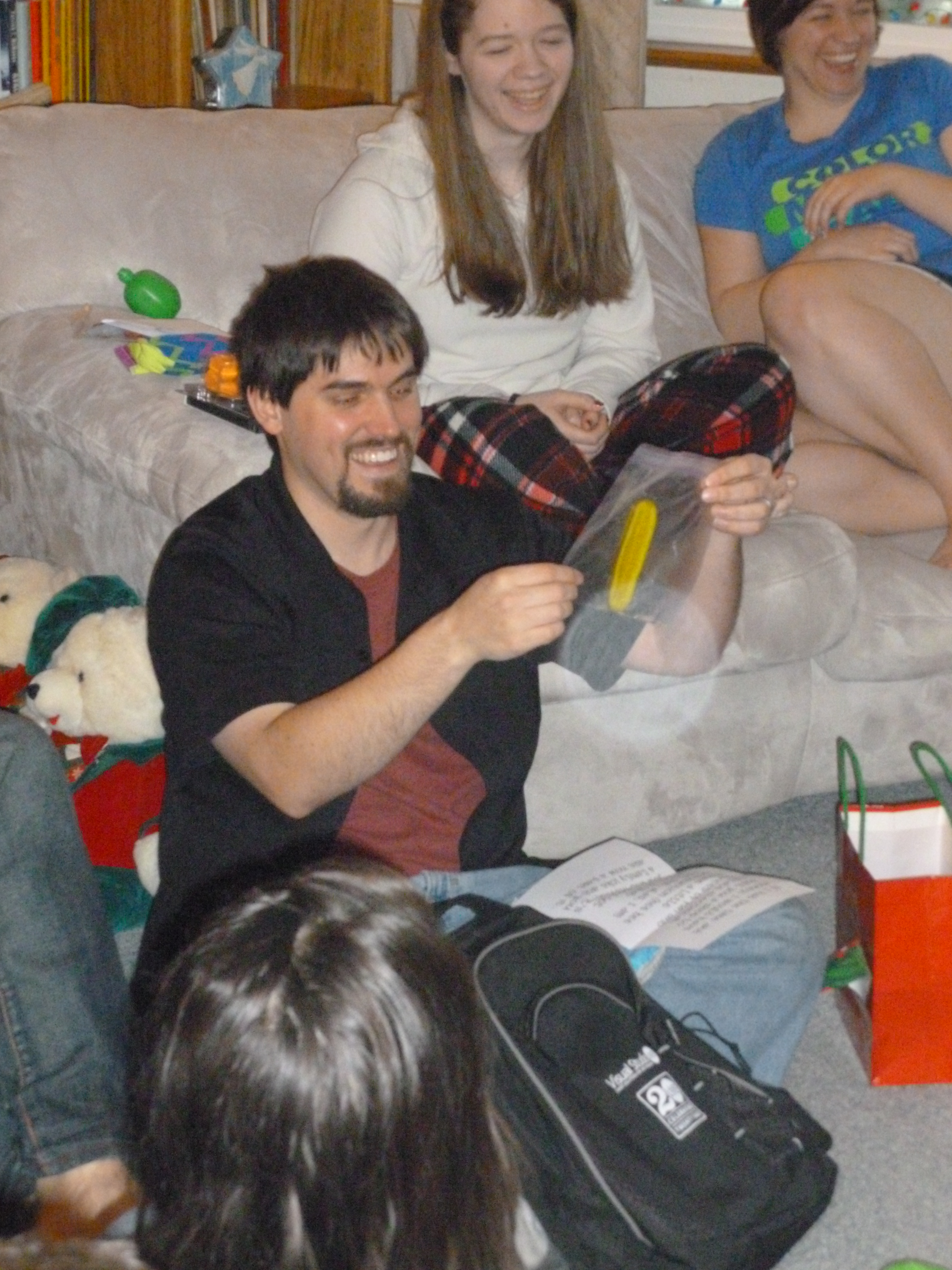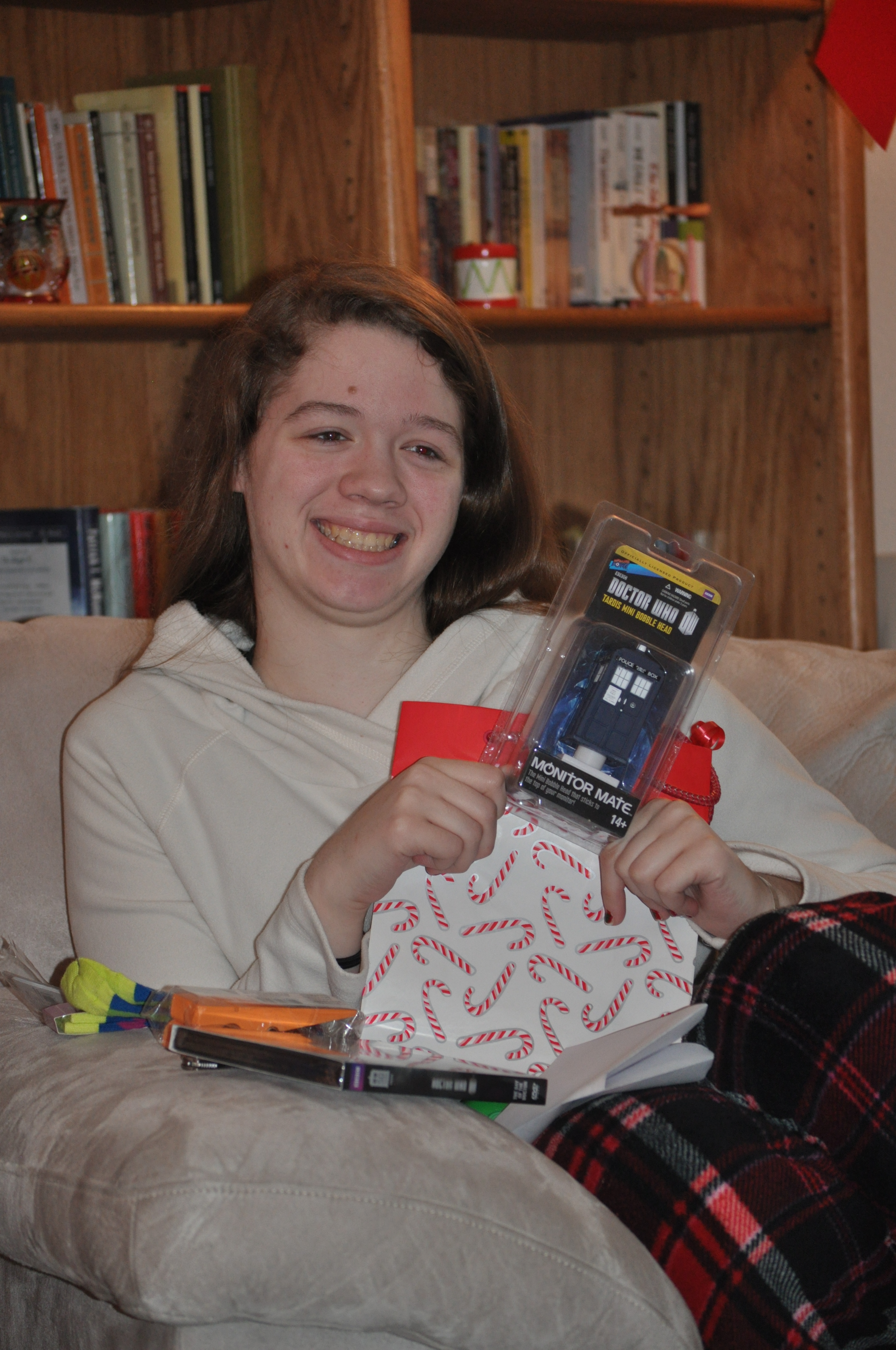 Darien gave Nathan a huge workshop in which to create interesting and/or destructive electronic toys. So what’s with the slice of pickle, you ask? That’s a loooooooong-standing family joke. When I was in high school, my brother Corey gave me a bookbark that was all green and on the top corner looked like it had a bite taken out of it. The bookmark read, “This isn’t a bookmark. It’s a flat pickle.” So, every Christmas, at various times, someone will make a joke about some package being a flat pickle. Darien just figured it was about time someone DID get a flat pickle!