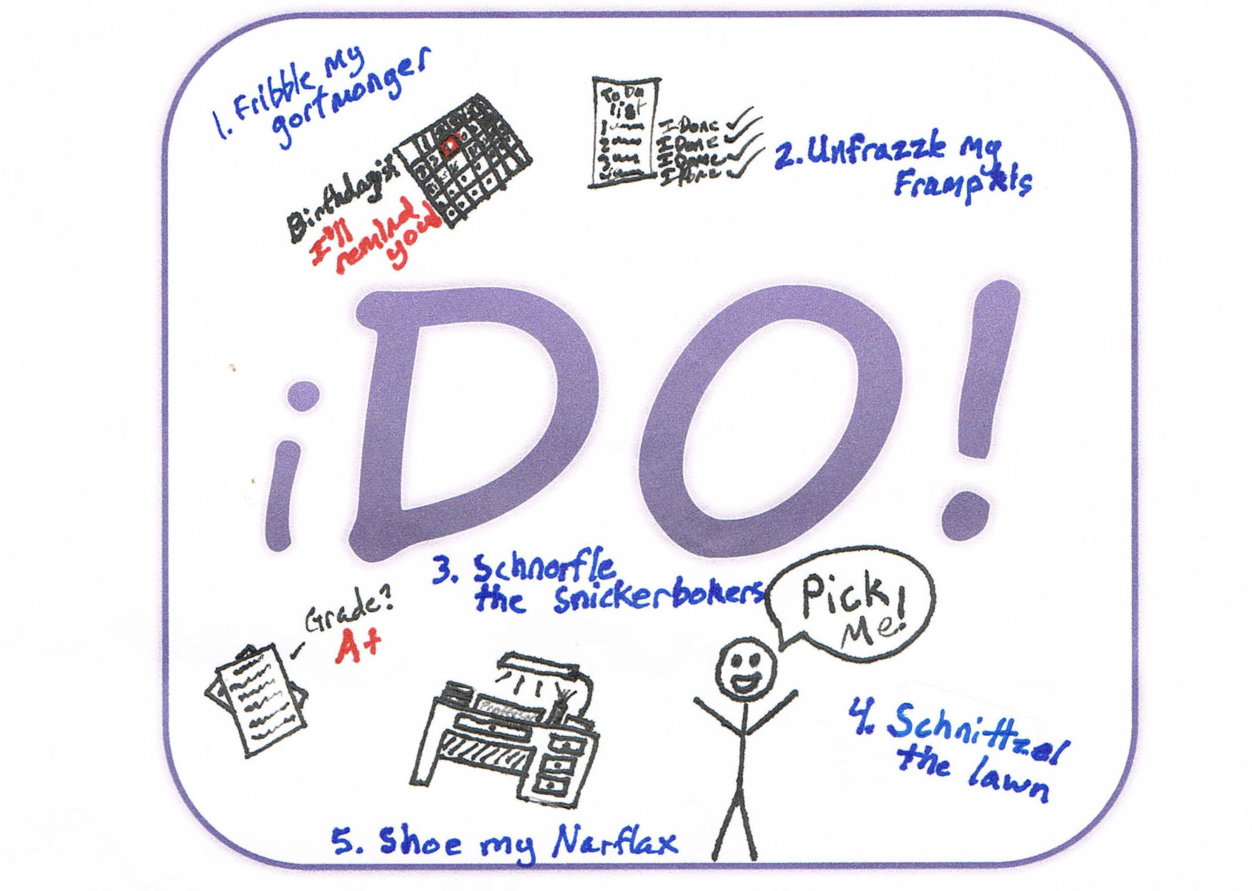 My brother, Tim, a physics prof at Azusa Pacific, was up from SoCal to see our mom. He is a wonderful guy, witty, thoughtful, tender-hearted….. and as disorganized as you will ever find. He is chronically behind on grading tests and papers, his office shelves look like an office supply store exploded, and I don’t know if he even remembers what color the carpet is under all the files, books, and other detritus thereon. So, we gave him a new app – the “iDO”. When he needs something done, he just has to say, “Who wants to …?” and “iDO!” Jillian designed the button for it with many helpful suggestions for the app to do, such as “schnorfle the snickerbokers” and “unfrazzle my frumpkis”.