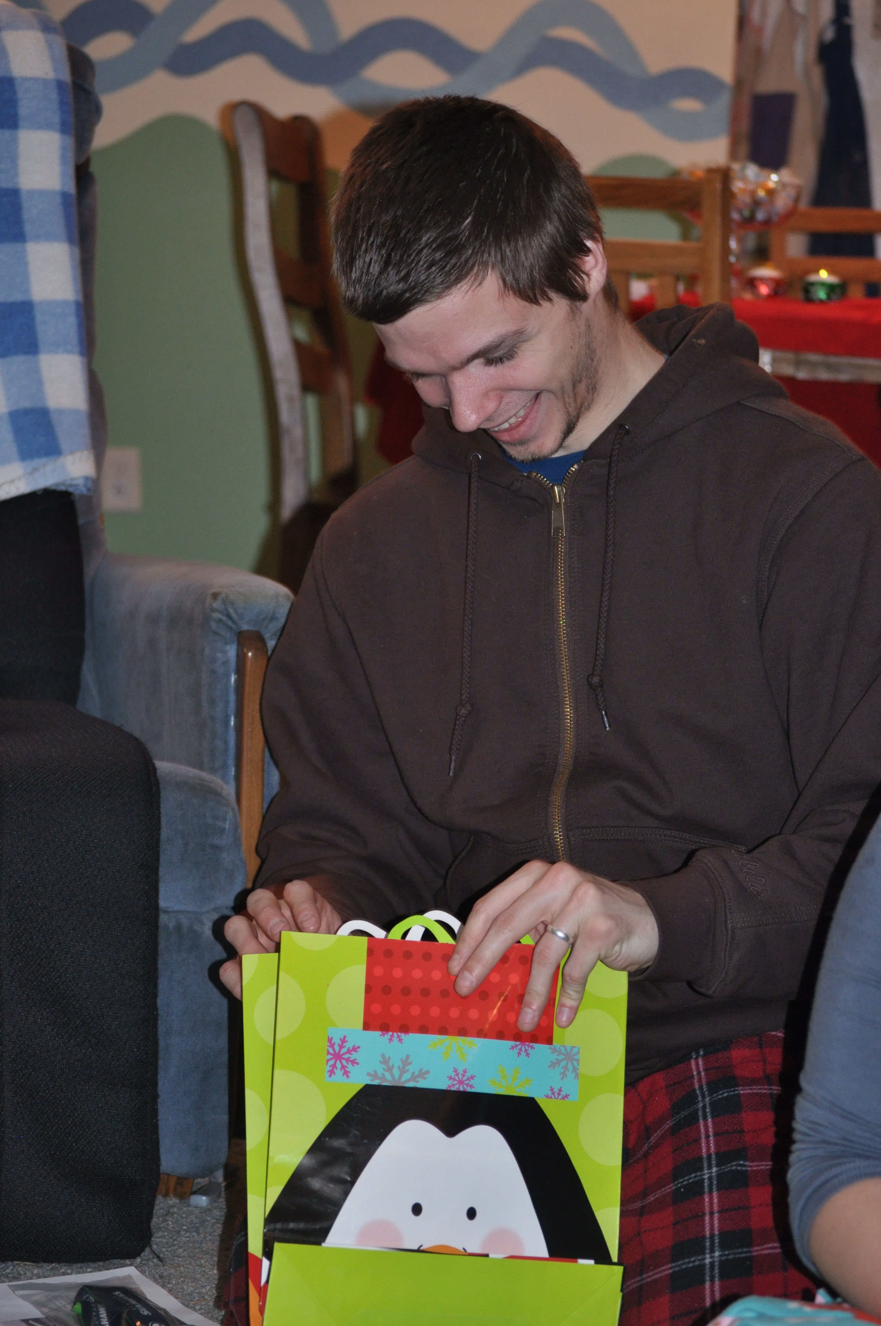 The two most elaborate gifts were put together by the two family members who I think any of us least expected it from. Nathan gave Cherry a trip around the world. That is, he wrote out THREE PAGES of an itinerary. It detailed where she’d go. It detailed how she’d travel – for instance, by elephant from Thailand to Australia. It detailed the kinds of things she would buy where, and came complete with homing drones to carry all of her purchases home so she wouldn’t have to worry about shipping. The description was filled with bits such as “Run out of money? Just print more. (Hey, it works for the government!)” In the very first paragraph, she was instructed to bring with her a bag of marshmellows, and throughout the trip, there would be a reminder about that bag of marshmellows. At the end, she finds out that that day is the pilot’s birthday, and, luckily, she has a birthday present on hand for him: a bag of marshmellows!